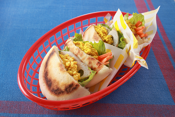 - 木綿豆腐とターメリックを使用し、風味豊かでおいしい卵もどきに仕上げています。ピタパンもほどよい弾力があり、満足感のある一品です。