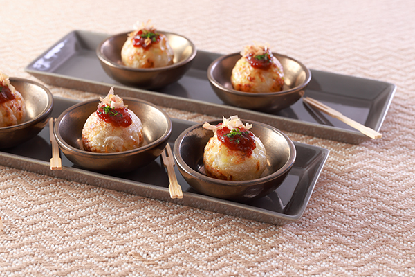 - 多くの方々に幸せな気分で安心して美味しく食べていただきたいとの思いから生まれた作品です。小麦粉や卵を使用せず、ライスペーパーで具を包むことで表面はパリッ!中はフワッ!と仕上がります。タコ焼き初心者の方にもおすすめの作り方です。