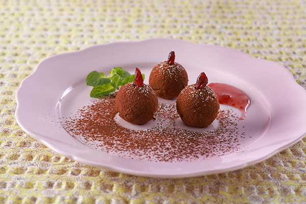 - なめらかな口あたりと、いちじくのプチプチ食感が面白いテリーヌです。ココアとゴボウの香りが引き立つ、新しい感覚のデザートです。