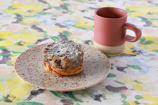 - ひよこ豆の水煮汁、豆腐、米粉、アーモンドを加えた独創的なフィナンシェです。甘さと香ばしさが絶妙で、ティータイムにもよく合う作品です。