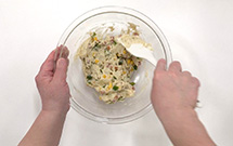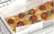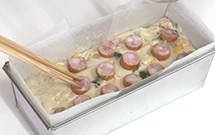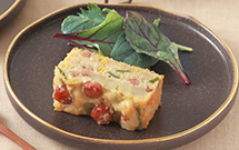 - 「お米で作ったから揚げ粉」のおいしさを唐揚げ以外の料理に活かしたいとの想いから考えたお総菜ケーキです。卵と水分量がほぼ同じバナナをつなぎにすることで甘味と塩味のバランスを整えました。